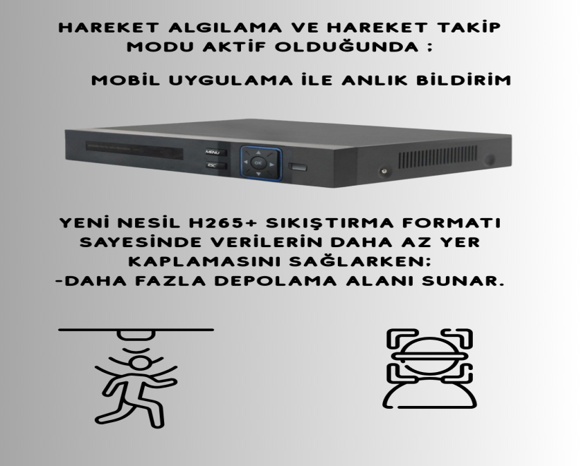- 32 kanal kayıt cihazı sayesinde birden fazla noktayı aynı anda izleyebilme imkanına sahip olun.